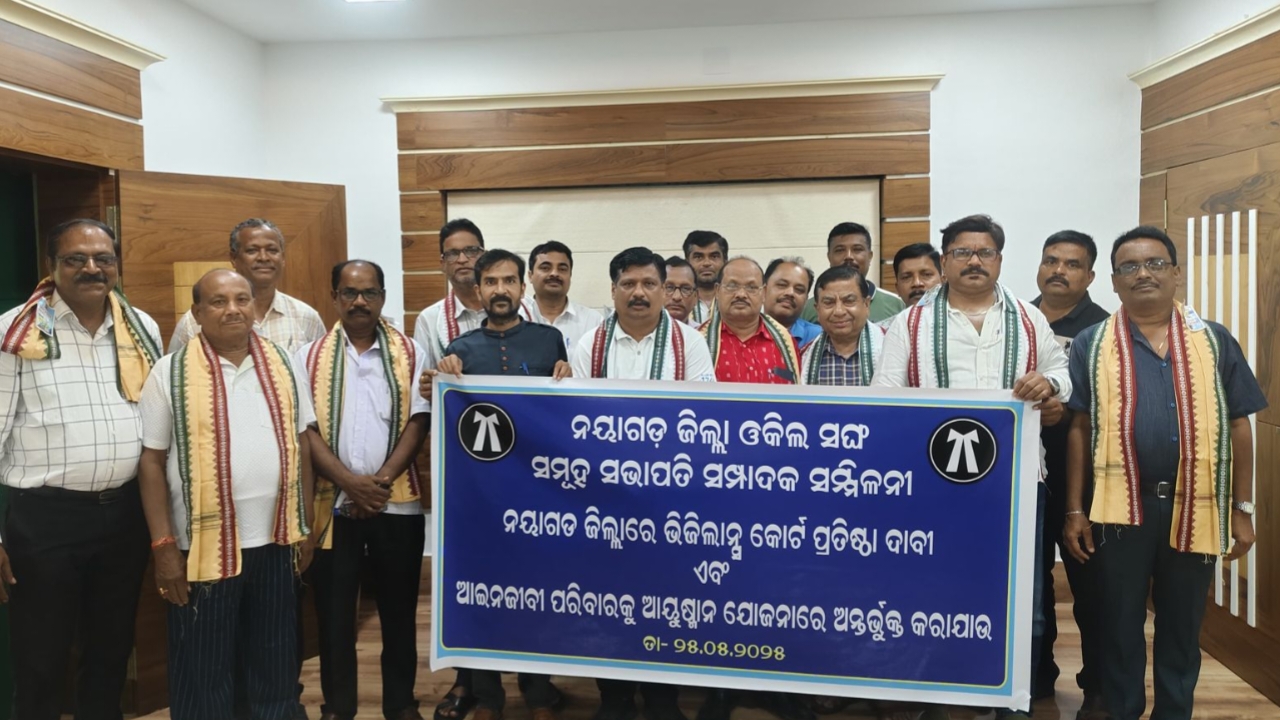 ଆଇନଜୀବୀ ପରିବାର କୁ ଆୟୁଷ୍ମାନ ଯୋଜନା ରେ ଅନ୍ତର୍ଭୁକ୍ତ ଏବଂ ନୟାଗଡ ଜିଲ୍ଲା ରେ ଭିଜିଲାନ୍ସ କୋର୍ଟ ପ୍ରତିଷ୍ଠାନିମନ୍ତେ ପୂର୍ତ୍ତ ବିଭାଗ ଡାକ ବଙ୍ଗଳା ଠାରେ ବୈଠକ ଅନୁଷ୍ଠିତ