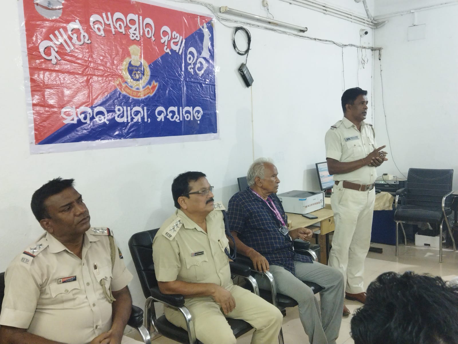 ନୟାଗଡ଼ ସଦରଥାନା ପରିସର ରେ ଆଜି ସନ୍ଧ୍ୟା 6ଘଟିକା ସମୟ ରେ ନ୍ୟାୟ ବ୍ୟବସ୍ଥା ର ନୂଆ ରୂପ କୁ ନେଇସଦର ଥାନା ଅଧିକାରୀ ଶରତ ଚନ୍ଦ୍ର ସେଠି ଙ୍କ ତତ୍ୱାବଧାନ ରେ ସଚେତନତା କାର୍ଯ୍ୟକ୍ରମ ଅନୁଷ୍ଠିତ ହୋଇଛି, ଏହି ଅବସର ରେ ସଦର ଥାନା ଅଧିକାରୀ ଶରତ ଚନ୍ଦ୍ର ସେଠି ଆଇନ ର ଗଢି ଉଠିଥିବା ନ୍ୟାୟ ବ୍ୟବସ୍ଥା ର ଆଇନ ବ୍ୟବସ୍ଥା ର ନୂଆ ରୂପ କୁ ନେଇ ଉପସ୍ଥିତ ଥିବା ସଦର ଥାନା ଅଞ୍ଚଳ ର ସମସ୍ତ ଜନ ପ୍ରତିନିଧି, ବୁଦ୍ଧିଜିବି ଙ୍କ ଗହଣ ରେ ନିଜର ବକ୍ତବ୍ୟ ପ୍ରଦାନ କରି ଆଇନ ବିଷୟ ରେ ତଥା ବ୍ୟବସ୍ଥାବିଷୟ ରେଅବଗତ କରିଥିଲେ,ଆଇନ ସଂହିତା ର ପରିବର୍ତ୍ତନ, ଅପରାଧ କୁ ନେଇ ଆଇନ ଓ ପୋଲିସ ନିକଟ ରୁ କିପରି ସୁବିଧା ସୁଯୋଗ ମିଳିପାରିବ ଆଲୋକ ପାତ କରିବା ସହିତ ବିଭିନ୍ନ ଆଇନ ଆଧାରିତ ସମସ୍ୟା କୁ ନେଇ ସଚେତନତା ବାର୍ତା ଦେଇ ଥିଲେ,ଆଇନ,ଆଧାରିତ ସମସ୍ୟା କୁ କିପରି ଯଥା ଶୀଘ୍ର ସମାଧାନ କରାଯିବ ତାହା ଉପରେ ସଚେତନତା କରି ବାର୍ତା ପ୍ରଦାନ କରିଥିଲେ,