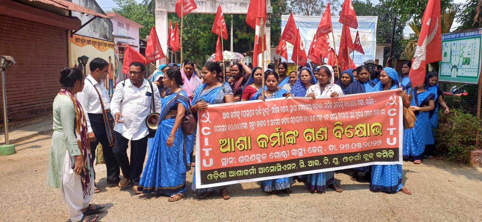 CITU ନେତୃତ୍ବରେ ଓଡ଼ିଶା ଆଶା କର୍ମୀ ଆସୋସିଏସନ୍ ତରଫରୁ ୧୪ ଦଫା ଦାବୀ ନେଇ ଶରଣକୁଳୁ ଗୋଷ୍ଠି ସ୍ୱାସ୍ଥ୍ୟ କେନ୍ଦ୍ର ସମ୍ମୁଖରେ ଶତାଧିକ ଆଶା କର୍ମୀଙ୍କ ଗଣବିକ୍ଷୋଭ ସଙ୍ଗଠିତ ହୋଇଥିଲା। ଏକ ଶୋଭା ଯାତ୍ରା ପୂର୍ତ୍ତ ବଙ୍ଗଳା ଠାରୁ ବାହାରି ବଜାର ପରିକ୍ରମା କରି ସ୍ଵାସ୍ଥ୍ୟ କେନ୍ଦ୍ର ସମ୍ମୁଖରେ ଗଣବିକ୍ଷୋଭ କରା ଯାଇଥିଲା। ସାଥୀ ଚାପଧାରୀ ରାଉତ ଙ୍କ ସଭାପତିତ୍ବ ରେ ଅନୁଷ୍ଠିତ ବିକ୍ଷୋଭ ସଭାରେ କେନ୍ଦ୍ର ଓ ରାଜ୍ୟ ର ଡବଲ ଇଞ୍ଜିନ ସରକାର ଙ୍କ ଶ୍ରମିକ ନିରୋଧି ନିଷ୍ପତି କୁ ତୀବ୍ର ସମାଲୋଚନା କରିଥିଲେ।
