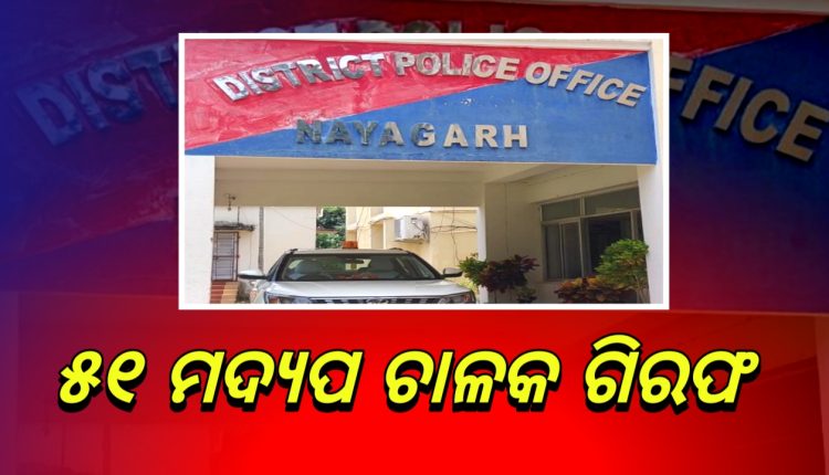 ନୟାଗଡ଼ ଜିଲ୍ଲା ପୋଲିସ ପକ୍ଷରୁ ସ୍ୱତନ୍ତ୍ର ଅଭିଯାନ ମାଧ୍ୟମ ରେ ଜିଲ୍ଲା ର ବିଭିର୍ନ ଥାନା ପୋଲିସ ପକ୍ଷରୁ ଗାଡି ମୋଟର ଯାଞ୍ଚ କରାଯାଇ ଥିଲା, ଏହି ଯାଞ୍ଚ ସମୟ ରେ ମଦ୍ୟ ପାନ କରି ଗାଡି ଚଳାଉ ଥିବା 51ଜଣକୁ ପୋଲିସ ଗିରଫ କରିଛି,51ଜଣକ ବିରୁଦ୍ଧରେ ମାମଲା ରୁଜୁ ହୋଇଛି, ଜିଲ୍ଲା ପୋଲିସ ପକ୍ଷରୁ ମିଳିଥିବା ସୂଚନା ଅନୁସାରେ ନୟାଗଡ଼ ଟାଉନ ଥାନା ପୋଲିସ 5, ସଦର ଥାନା ପୋଲିସ 5, ଇଟାମାଟି 5, ନୂଆଗାଁ 2, ଦଶପଲ୍ଲା 3, ଵାଣିଗୋଚ୍ଛା 1, ଖଣ୍ଡପଡ଼ା 2, ଫତେଗଡ଼ 7, ଗଣିଆ 5, ଶରଣକୂଳ 2, ଓଡ଼ଗାଁ 5, ରଣପୁର 5, ଚାନ୍ଦ ପୁର ପୋଲିସ 4ଜଣକୁ ଗିରଫ କରିବା ସହ ସମାନ ମାମଲା ରୁଜୁ କରିଛି,